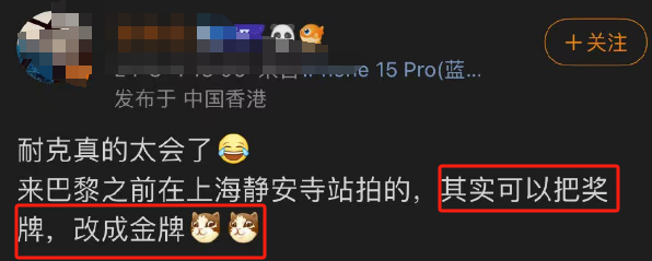 说到“巴黎纪念品”,不得不说还有人建议耐克给郑钦文策划广告语,还可以大胆一点:想带走的巴黎纪念品只有金牌。