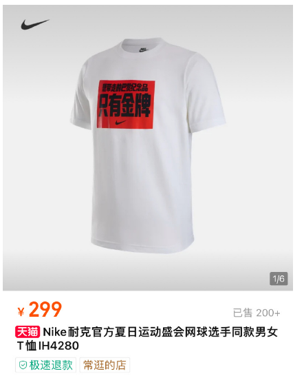 网球赛后也有人冲到耐克评论区刷评论,一人一句说要“金牌”文化衫,耐克也上架“想带走的巴黎纪念品只有金牌”文化衫 。
