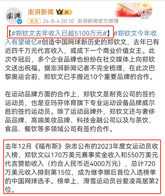 这不,有人盘点郑钦文至少手握10个品牌赞助,包括支付宝、劳力士、斯维诗、麦当劳、伊利、霸王茶姬、兰蔻等,曝光郑钦文去年收入超过5100万元,是李娜之后第一个登上福布斯榜单的中国网球女运动员。