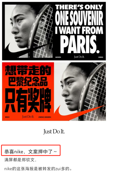 郑钦文赛后发的一条微博,表示“带走了最想要的巴黎纪念品”,不要小看这句话含金量,与耐克前期海报呼应了。