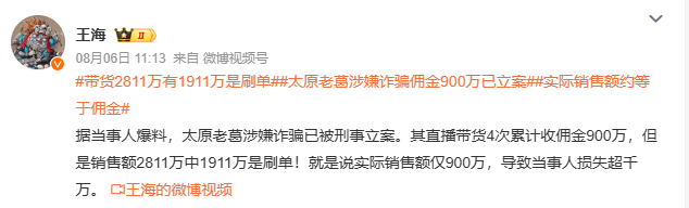 视频中,王海透露,根据当事人的爆料,太原老葛因涉嫌诈骗已被刑事立案。其直播带货4次累计收佣金900万,但是销售额2811万中1911万是刷单!就是说实际销售额仅900万,导致当事人损失超千万。