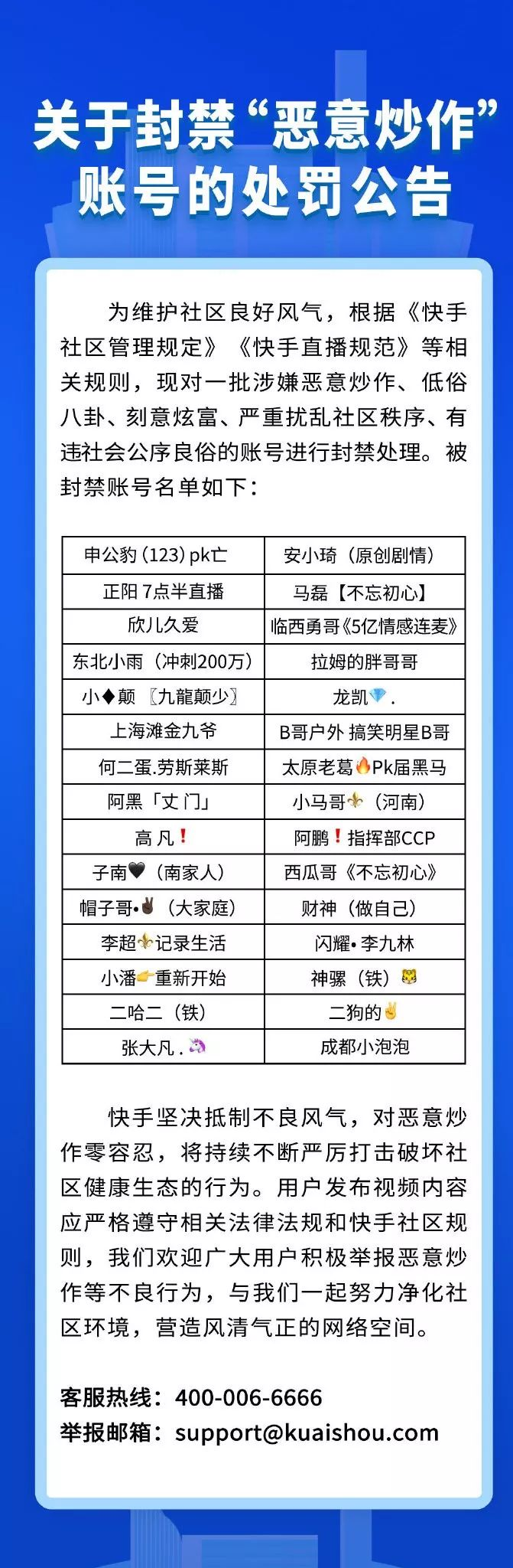2019年9月11日晚,快手官方账号发布处罚公告,太原老葛因涉嫌恶意炒作、低俗八卦、刻意炫富等行为,严重扰乱社区秩序,有违社会公序良俗,被永久封禁。