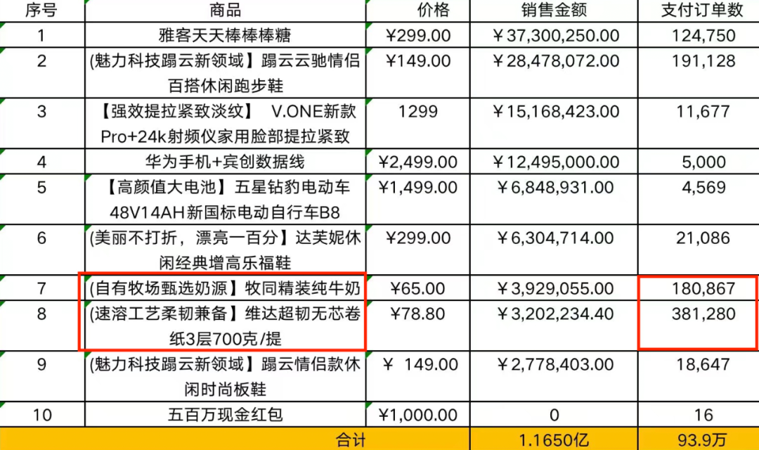 从该图来看,太原老葛此次的总销售额仅为1.16亿。销量第一的玉米须薏仁片和第三名的创维电视根本未入前十名之列,而号称卖了3140万的卷纸,真实销量仅有320万。牛奶的实际销售也不到飞瓜数据的15%。