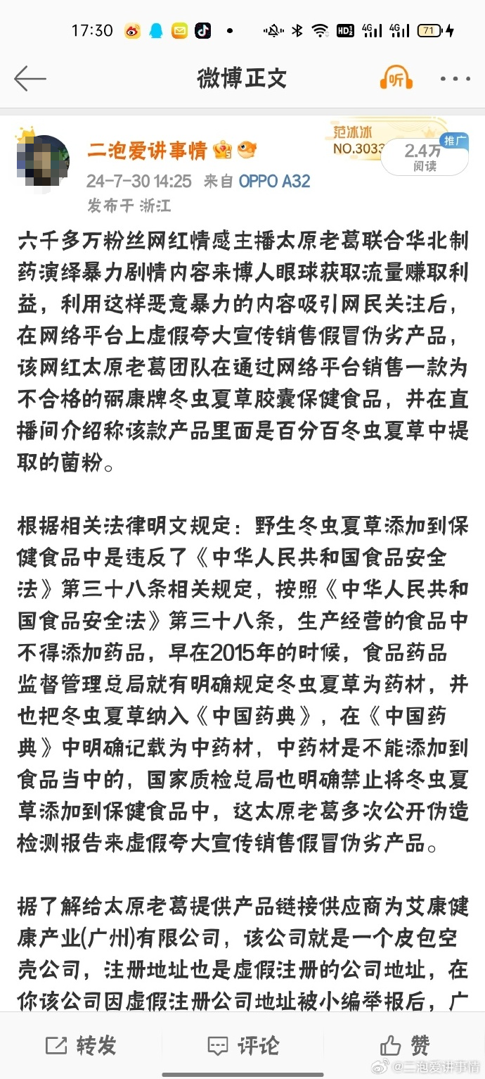今年7月30日,在微博上拥有22.4万粉丝的博主@二泡爱讲事情发文称,太原老葛在直播间推广销售一款不合格的弼康牌冬虫夏草胶囊保健食品,并称太原老葛说该款产品里面是百分百的冬虫夏草提取菌粉,涉嫌虚假宣传。