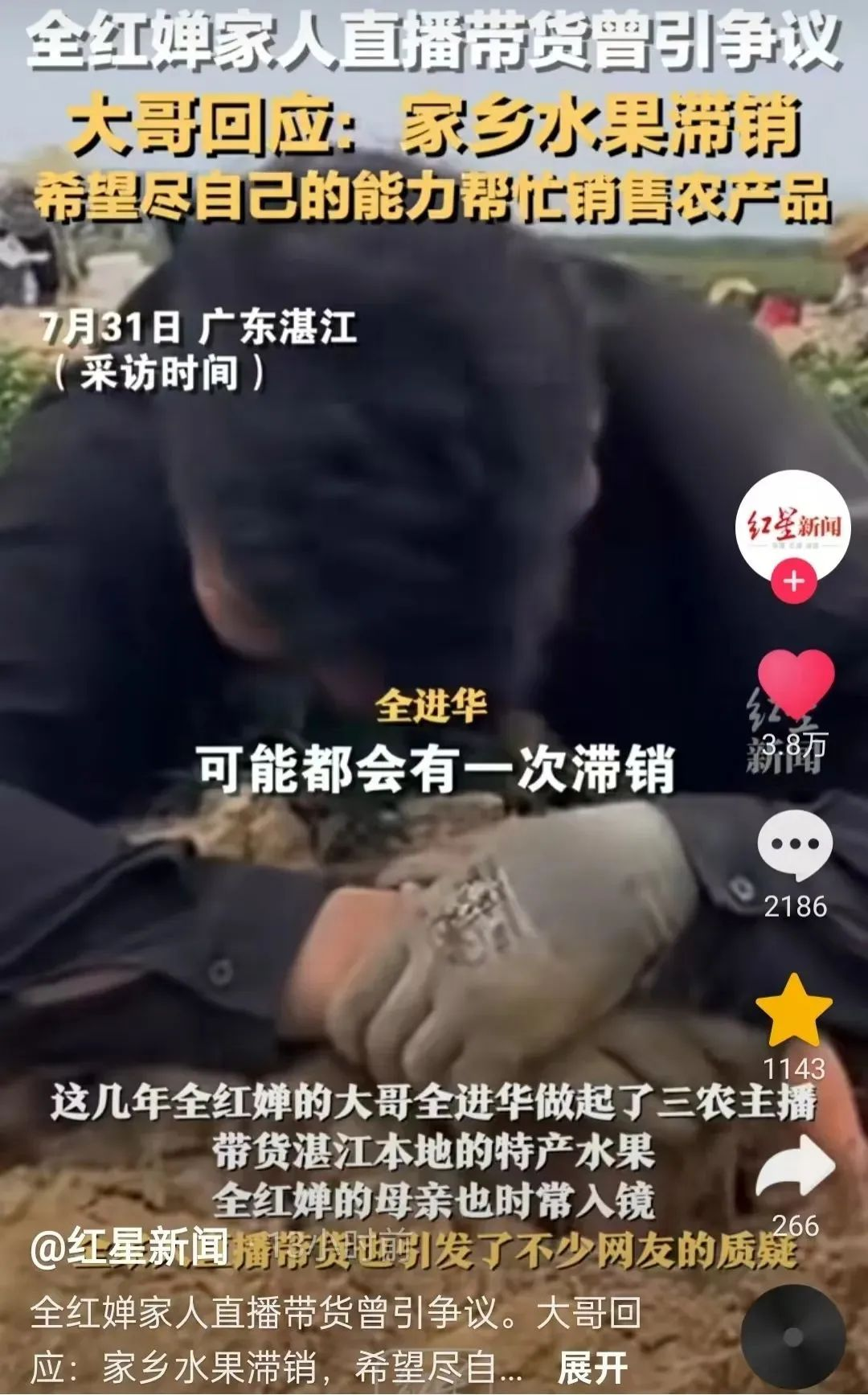 红星新闻:《全红婵大哥直播带货引争议,本人回应:家乡水果滞销,希望帮忙销售农产品》