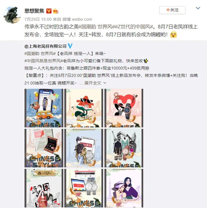 正所谓众人划船不用桨,全靠浪。老凤祥先是抛砖引玉,上线话题#国潮韵 世界风##Z世代的中国风##中国风就是世界风#,并打造系列破次壁联名海报,还发起锦鲤式宠粉活动【老凤祥·独宠一人】派送大福利;再借由其他大佬品牌带节奏——时尚星娱、凤凰网娱乐等蓝v扩散,实力演绎国潮风和现代潮流风的碰撞。
