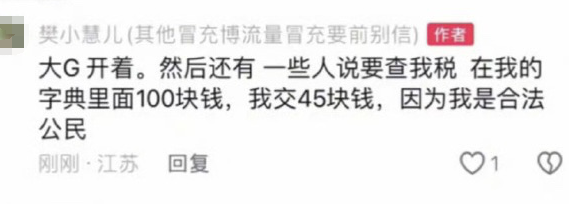 在凌达乐自曝收入后,就有网友称“我的建议是查查税”,而在樊小慧曝光收入后,不少人也是这么想的,樊小慧还在评论区回应道:“一些人说要查我税,在我的字典里面100块钱,我交45块钱,因为我是合法公民。”