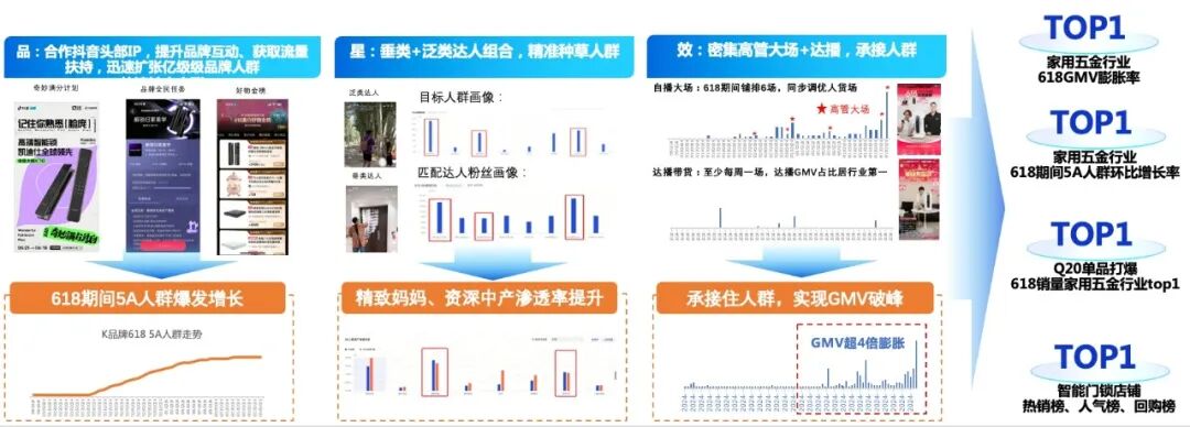 凯迪仕一方面通过「奇妙满分计划」IP活动,使旗下智能锁产品获得30+位明星大咖推荐,另一方面积极发布「品牌全民任务」、参与入选「好物金榜」,让用户更容易在「看」榜单、「刷」短视频时接触到自家王牌产品,最终人群资产亿级新增,GMV超4倍膨胀,实现声量+生意双爆发。