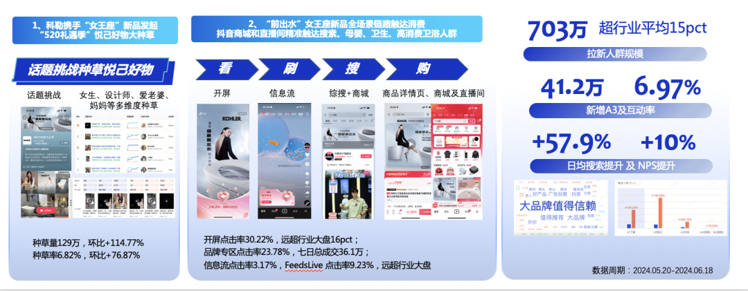 为打响女王座新品声量,科勒首先抢占开屏、信息流黄金位置,突出「女王座」、「创新前出水」等关键词,吸引母婴、卫生、高消费卫浴人群了解欲望。当用户产生搜索行为后,搜索品专进一步通过实时直播、好物推荐等形式,吸引用户进入直播间、点击商品,最终完成转化。活动期间,科勒拉新人群达703万,日均搜索提升57.9%。