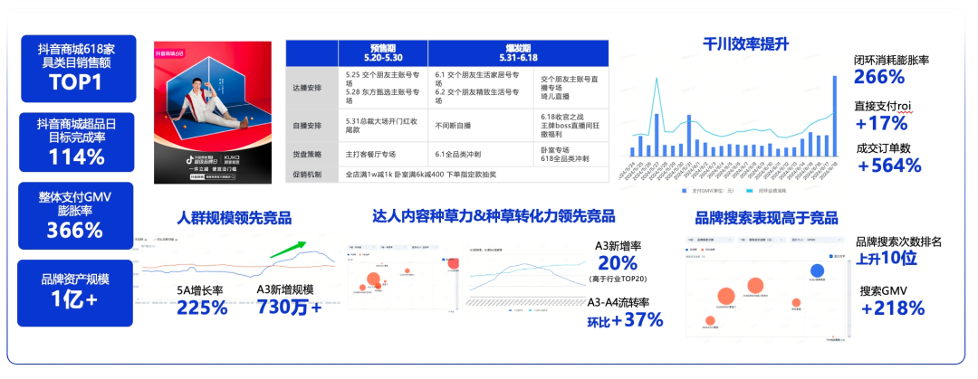 在内容场,顾家家居与头部达人合作,同时配合总裁自播、货盘调整、促销机制与搜索优化,突破了转化环节的“最后一公里”,使人群规模、种草能力、品牌搜索领先于竞品,最终GMV膨胀率366%,峰值期人群规模超过1亿,更是在618抖音商城超品日成功登顶家具类目TOP1。