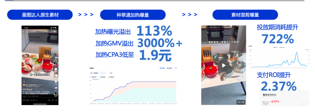 针对转化较好的素材,双立人在使用「种草通」加热爆量的同时,叠加以「全域推广」,对二创混剪素材进行投放,进一步提升ROI。投放期间,「种草通」加热GMV溢出超3000%,素材混剪投放消耗提升 722%,支付ROI提升 2.37%,用优质素材巧妙撬动了大促生意。
