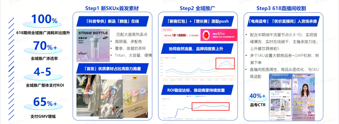 大促期间,乐扣乐扣将投放重点完全向「全域推广」倾斜,打破了抖音信息流推荐、直播广场、商城、搜索等流量壁垒,以整体ROI视角重新布局全域流量,实现了品牌词搜索与ROI的稳定提升。活动期间,乐扣乐扣「全域推广」渗透率超70%,消耗环比提升100%,整体支付ROI4-5,使新品水杯成功跻身赛道前列。
