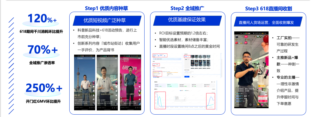 全域推广,不仅可以聚焦直播间整体ROI,帮助商家获取更多GMV增量,还能够让商家从机械的投放中解脱出来,有更多的时间和精力去打磨优质的素材和内容。