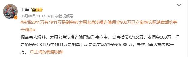8月6日时,打假人王海还在微博说过此事,王海称“根据当事人爆料,太原老葛因涉嫌诈骗已被刑事立案。其直播带货4次累计收佣金900万,但是销售额2811万中1911万是刷单!”