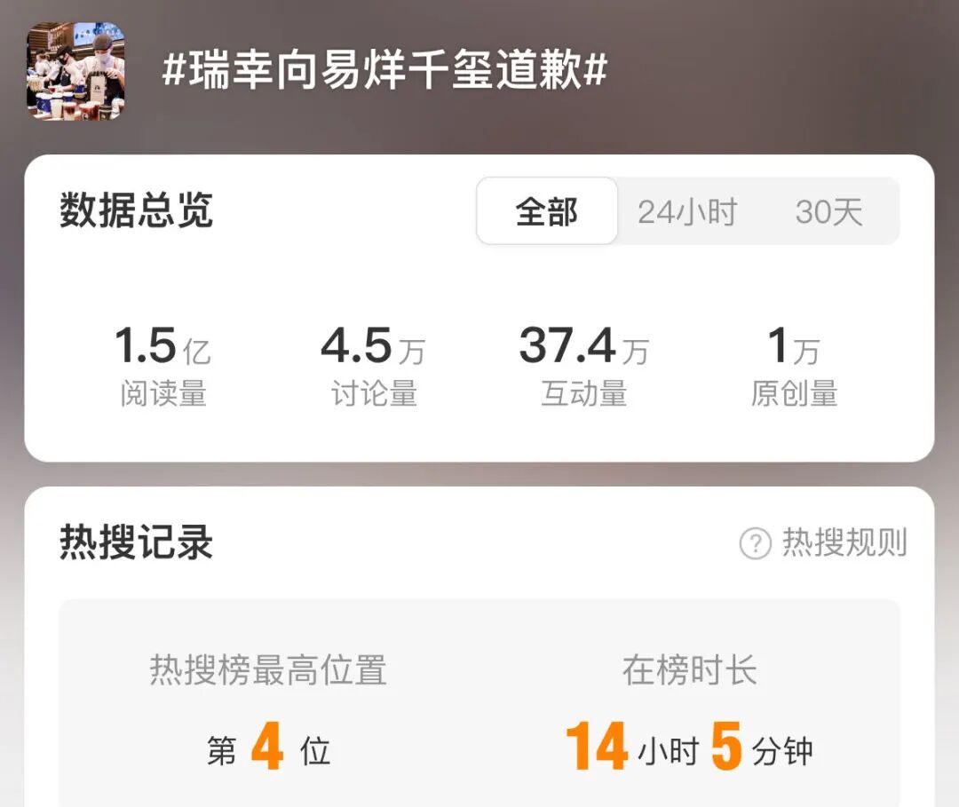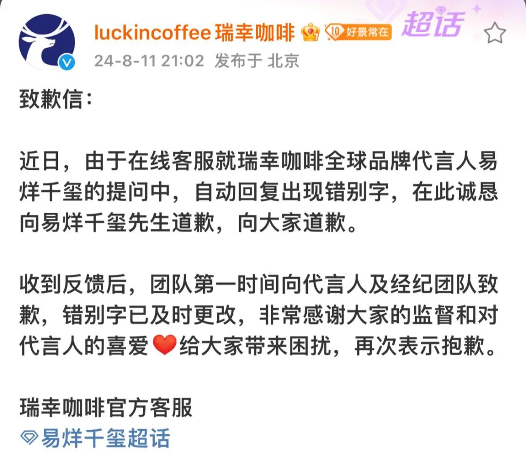 于是,我们看到,在巴黎奥运会结束的第一天,瑞幸咖啡就登上了热搜榜,话题是#瑞幸向易烊千玺道歉#。