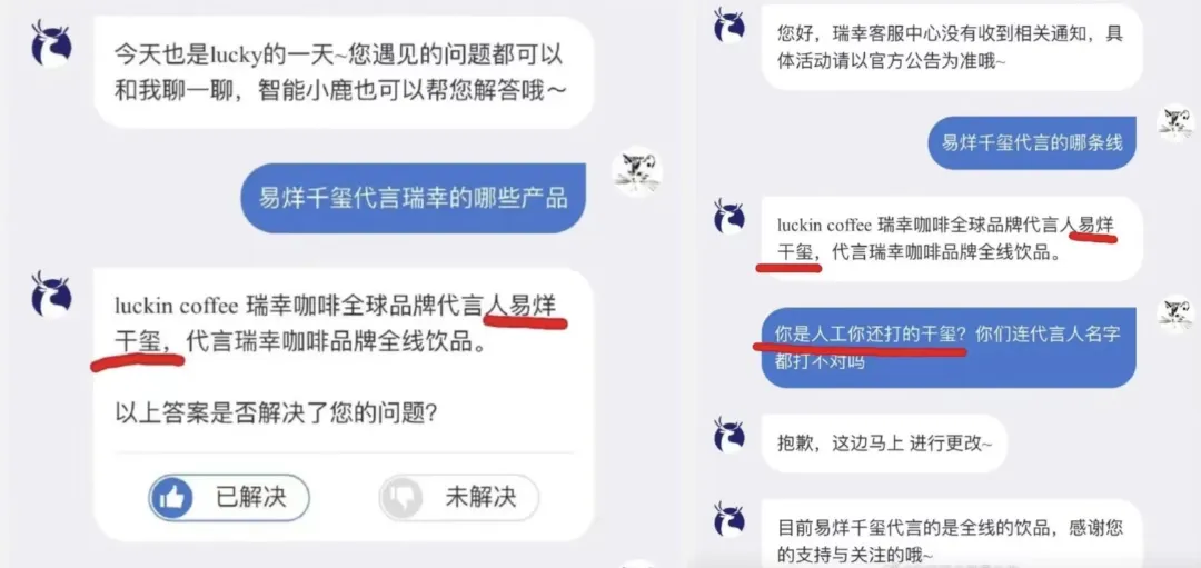 据媒体报道,在回复网友提问时,瑞幸的人工在线客服把易烊千玺的名字错打成了“易烊干玺”,而且还错了两次。