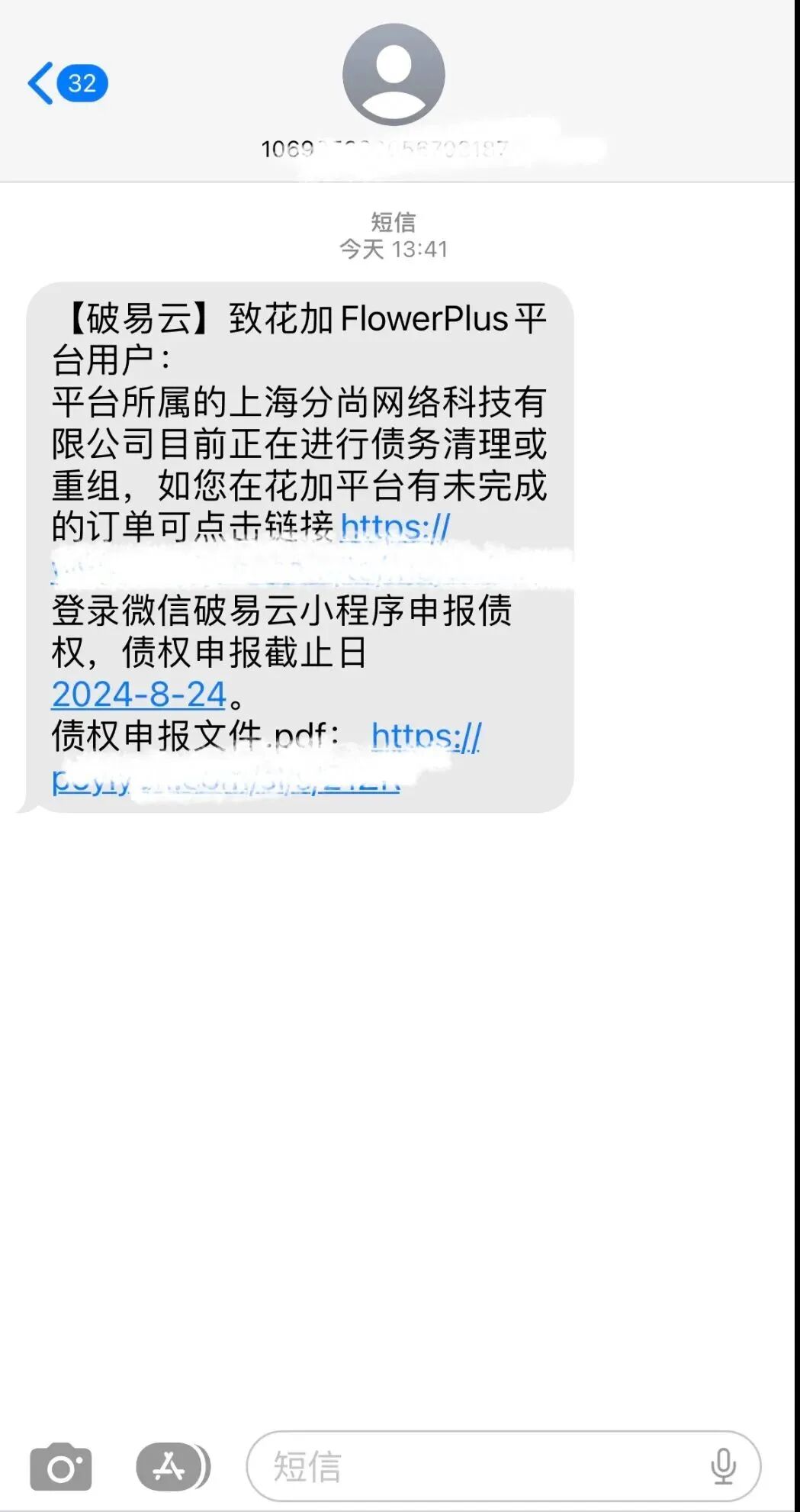 8月9,钛媒体报道称,有消费者收到了“破易云”平台发来的消息:“致花加 FlowerPlus 平台用户”信息,鲜花电商平台花加所属公司正进行债务清理或重组。