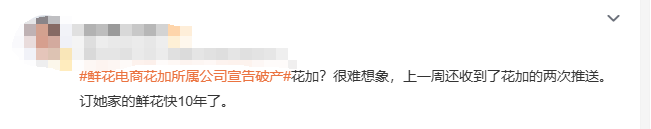 对于花加的破产有老客户表示:“很难想象,上一周还收到了花加的两次推送。订她家的鲜花快10年了。”