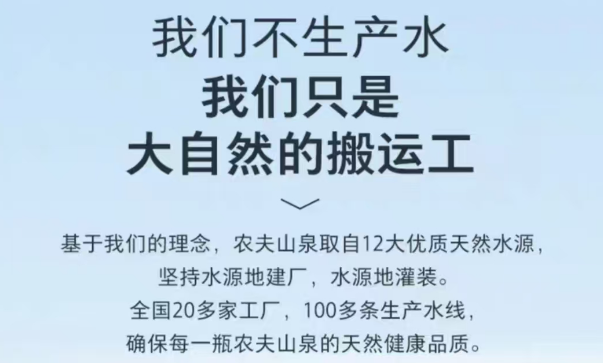 如果说“农夫山有点甜”是农夫山泉从口感体验层面表达天然,那么“大自然的搬运工”就是从品牌理念层面来呈现天然。