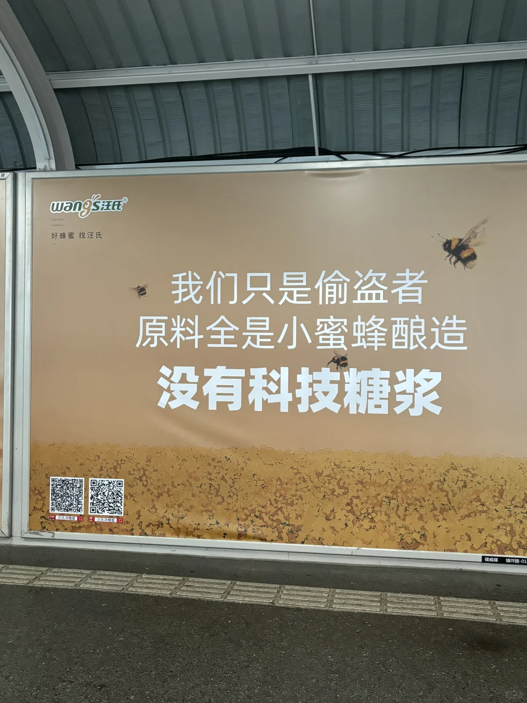 所以结合另一则“真蜂蜜”线下广告分析,不排除汪氏想借用蜜蜂形象,传递产品纯天然无添加,没有加科技狠活。
