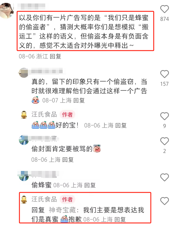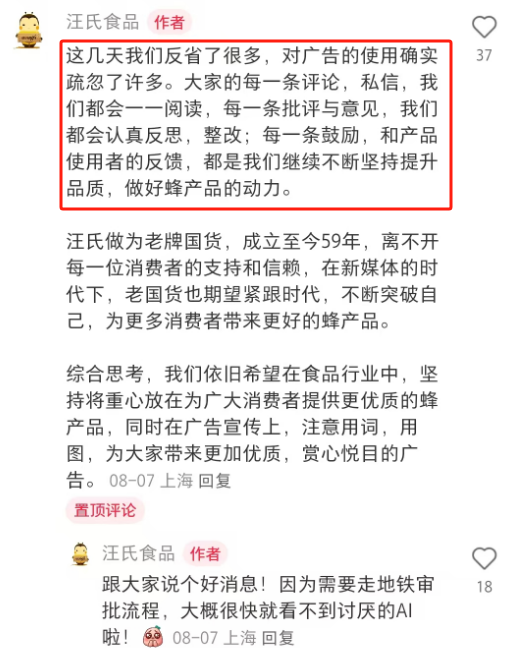 汪氏蜜蜂园也回应过,回应媒体称广告是公司在线下地铁广告位所做的创意测试;在官方小红书账号则留言初衷是表达“真蜂蜜”。