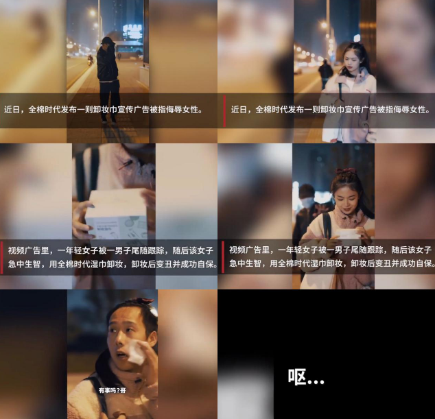 全棉时代拍的《防身术》卸妆巾广告,就是以“跟踪”为卖点,展现卸妆秒变男性后吓跑跟踪者,来突出卸妆巾卸妆很强的特点。