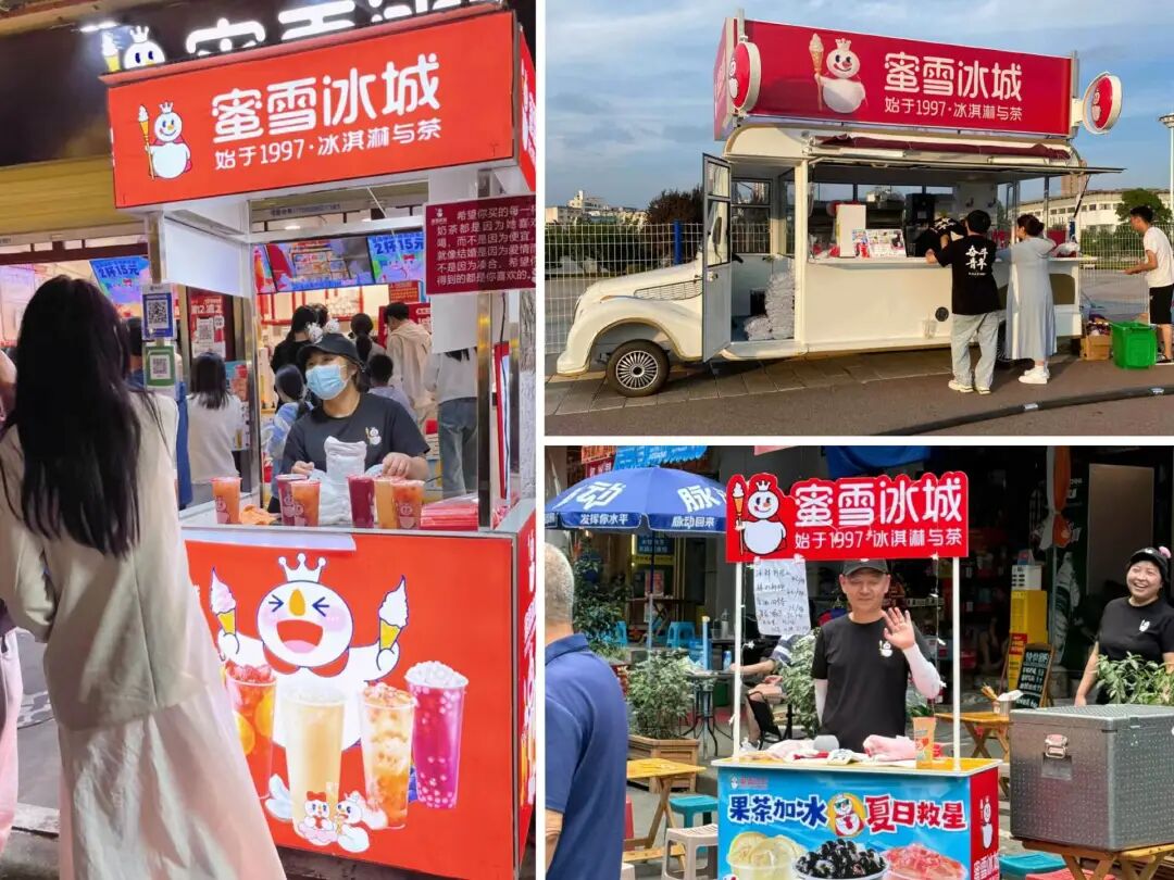蜜雪冰城也在安徽、辽宁、广西、福建等地的夜市、小吃街上曾开出了流动小摊。有的是带有蜜雪冰城品牌横幅的豪华小汽车,也有简便版的三轮车、小推车,还因此火上热搜,被不少网友心疼“雪王太努力了”。