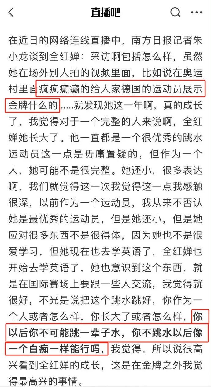《南方日报》体育记者朱小龙在直播连线时,吐槽全红婵“不会英语的话,不跳水以后就像个“白痴”、甚至用“疯疯癫癫”形容她的行为,字里行间尽秀知识优越感。