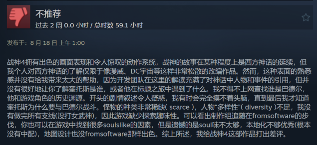 如果你打开《God of War》(国内俗称《战神4》)这款游戏的Steam评测区,仅看最新的中文评论,会发现近几日的评论在隔空打架。一边儿是打差评的玩家,批评声集中在没有简体汉化,以及“看不懂希腊神话故事”;另一边儿则是表示要捍卫《战神4》的评分,甚至直言不满《黑神话:悟空》这款游戏的粉丝刷恶评。