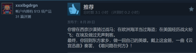 “你曾在西奈沙漠骑过战马;在欧洲海洋当过海盗;在美国经历战火纷飞;在埃及做过无声刺客。最终,你回到东方家乡,做一回自己的英雄。戴上这金箍,一曲《云宫迅音》奏罢,《敢问路在何方》!”这样一段感叹,出现在Steam平台《黑神话:悟空》的评论区,也出现在不同的社交媒体,已经不知道哪一则是“原创”,但这不重要。