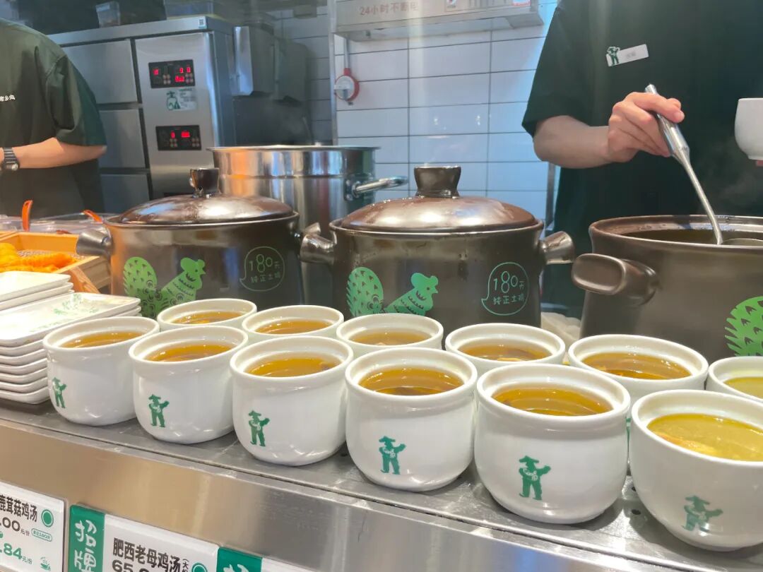在此次被王海打假后,氢消费实地走访一家老乡鸡发现,该店的招牌鸡汤堂食熬汤砂锅上依然印着“180天纯正土鸡”的字样。
