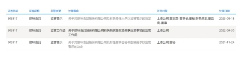 据上交所官网显示,2021年至2023年,绝味食品3次被采取监管措施,监管类型包括监管警示和监管工作函。