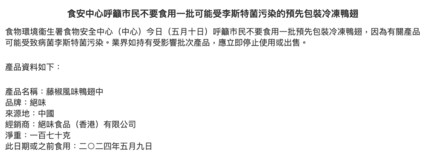 今年5月,香港食物环境卫生署食物安全中心发布公告称,绝味食品(香港)有限公司销售的一批鸭翅中可能受致病菌李斯特菌污染,要求停售及下架相关产品。公告显示,遭到病菌污染的是一批由绝味香港公司销售的预包装冷冻藤椒风味鸭翅中。