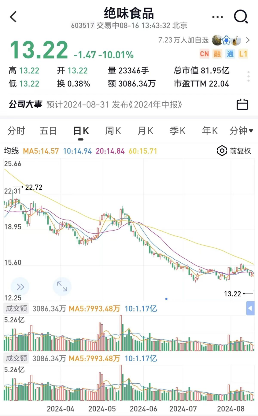 随着一纸公告发出,8月16日一开盘,绝味食品直接一字跌停,最新股价13.22元,市值81.95亿。