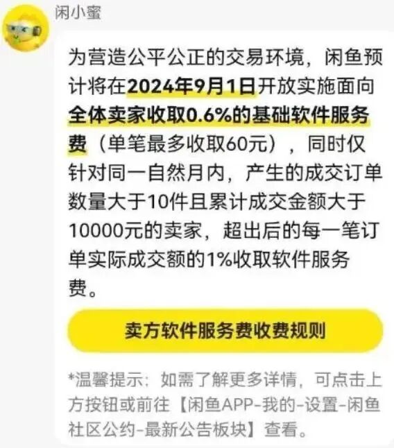 2024年闲鱼宣布了一项重要变革:自9月1日起,将面向全体卖家收取0.6%的基础软件服务费,单笔最高不超过60元。