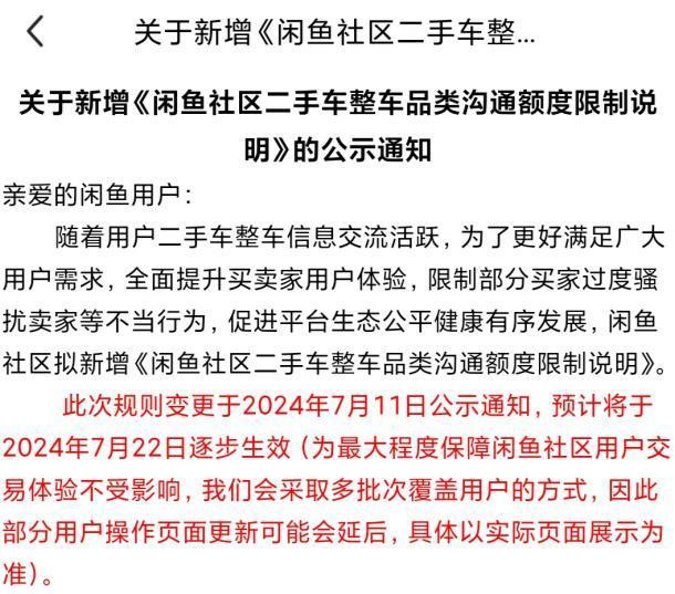 就在近日,闲鱼App变更“闲鱼社区二手车整车品类沟通额度限制说明”,对二手车整车品类卖家和就整车类信息进行私聊沟通的买家用户进行规定。