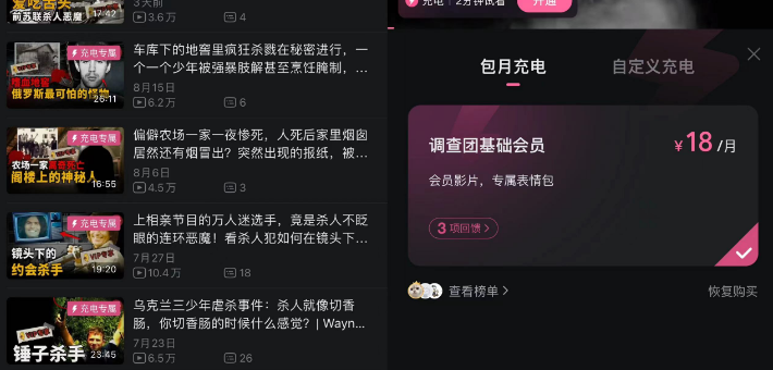 “之前看B站是大会员制,后来一些专业知识课程需要单独付费。最近我发现我平时关注的一些UP也加入了‘会员充电计划’,比如我很爱看一些真实悬疑案件解说的UP主,好几个都推出了‘充电专属’系列。‘充电专属’的视频也都是包月制度,很多频道都是十几块钱一个月。”B站用户莎莎(化名)这样说道。