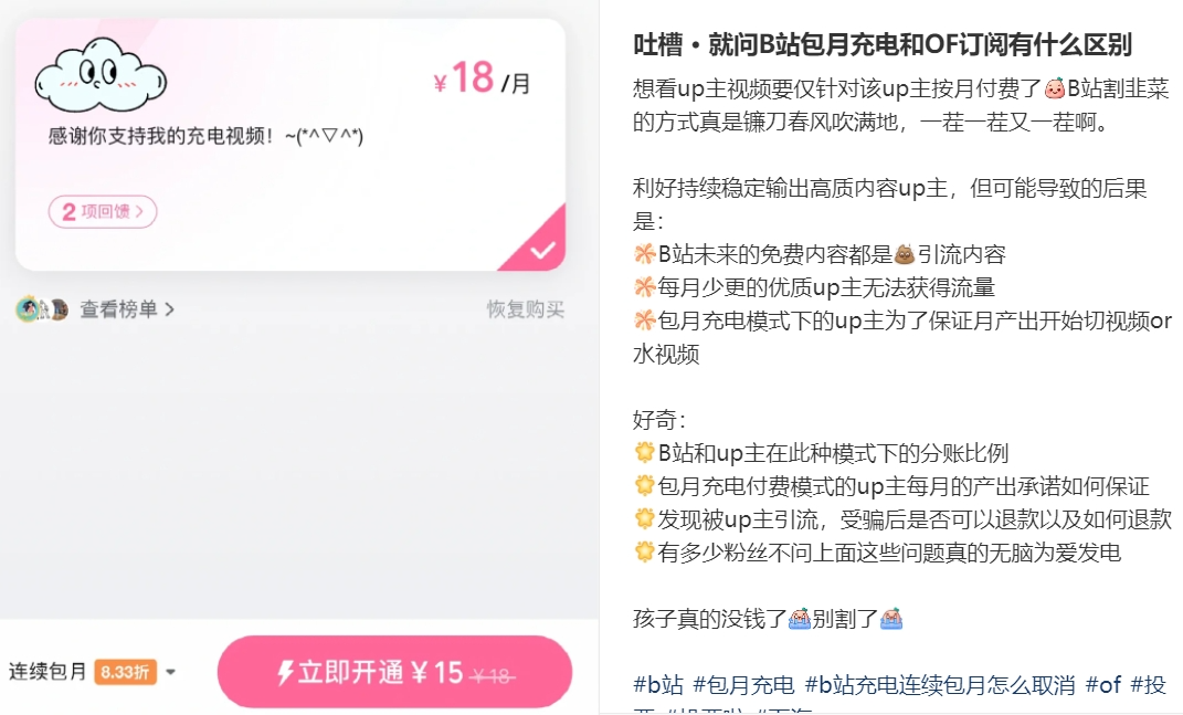 对于“充电专属”计划,莎莎并不反感,“不论是UP主还是平台,都是想要增加一个赚钱的通道,我认为这和长视频平台花钱提前解锁剧集是一个道理,这个选择留给我自己就好。”不过,社交媒体平台上还是有很多网友对此吐槽。