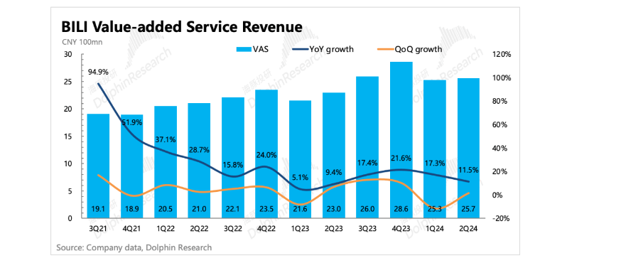 一方面来自于会员付费,二季度增值服务同比增长11.5%。但增值服务的收入增速实际上是在放缓的,这主要是因为本季度也是长视频的淡季,且直播打赏也没有特别出色的表现。