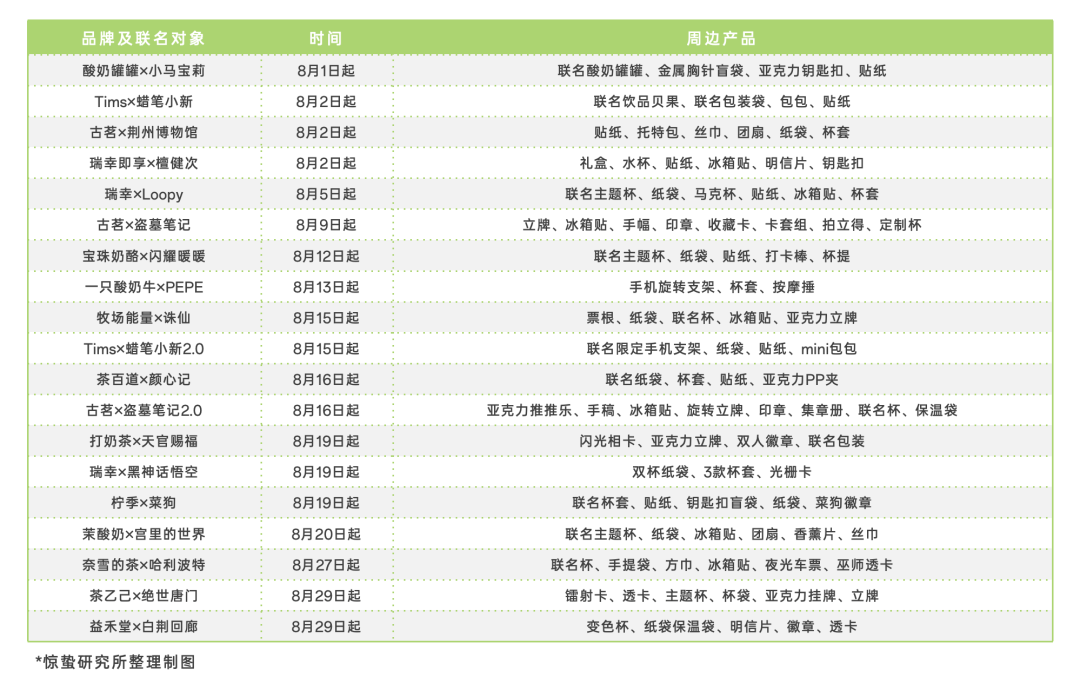 尤其是在夏季初秋这样的消费高峰期,各大新茶饮品牌都在全力抢滩。除了在产品本身上不断创新外,品牌们还在周边产品和服务上下足了功夫,忙着联名和设计周边,部分新茶饮品牌几乎每个月都会推出至少一款联名产品,想要以此寻找新的增长点和突破口。