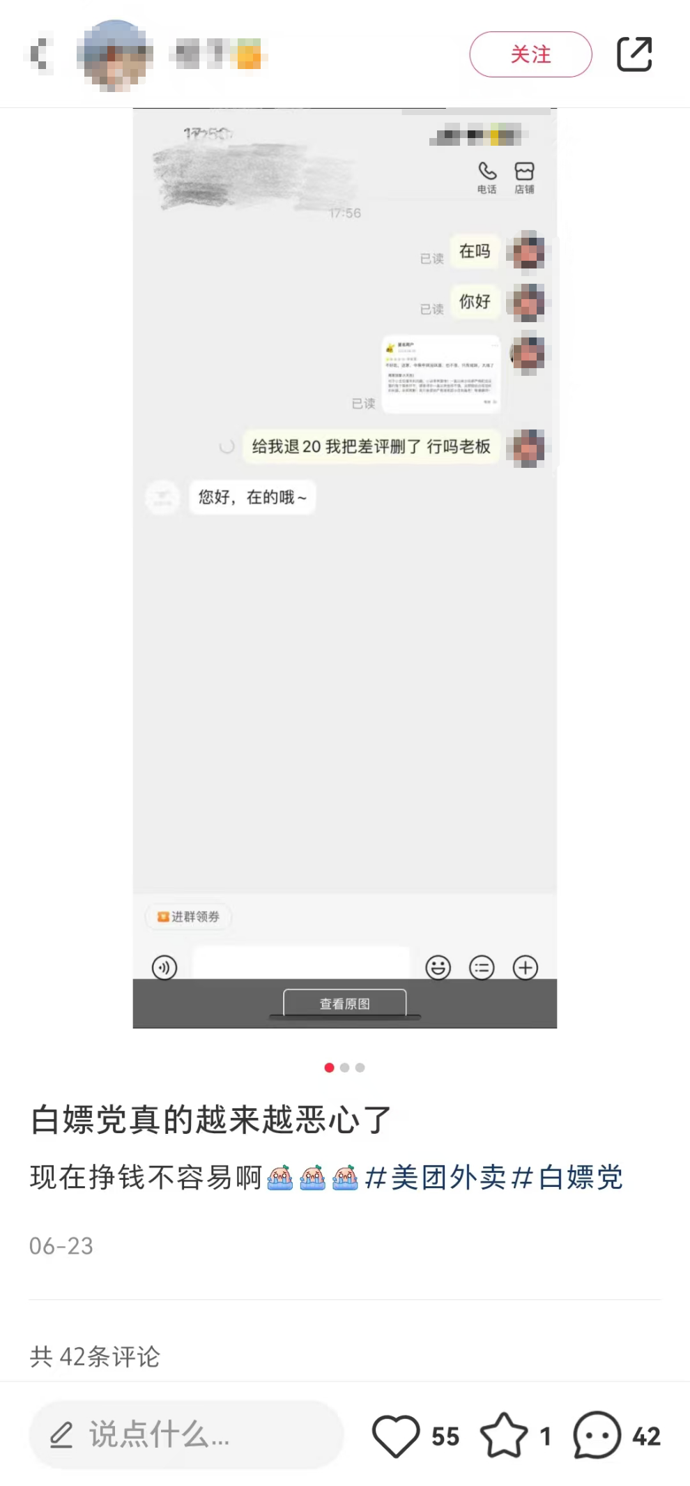 通常情况下,这些“白嫖党”会挑选一些刚上架美团的新店铺,因为这类店铺没有评论积累,一条差评或许影响到店铺的销售。另外,经营者没有过多的行业经验,遇到这种事只能同意“仅退款”并且给钱让“白嫖党”删差评。