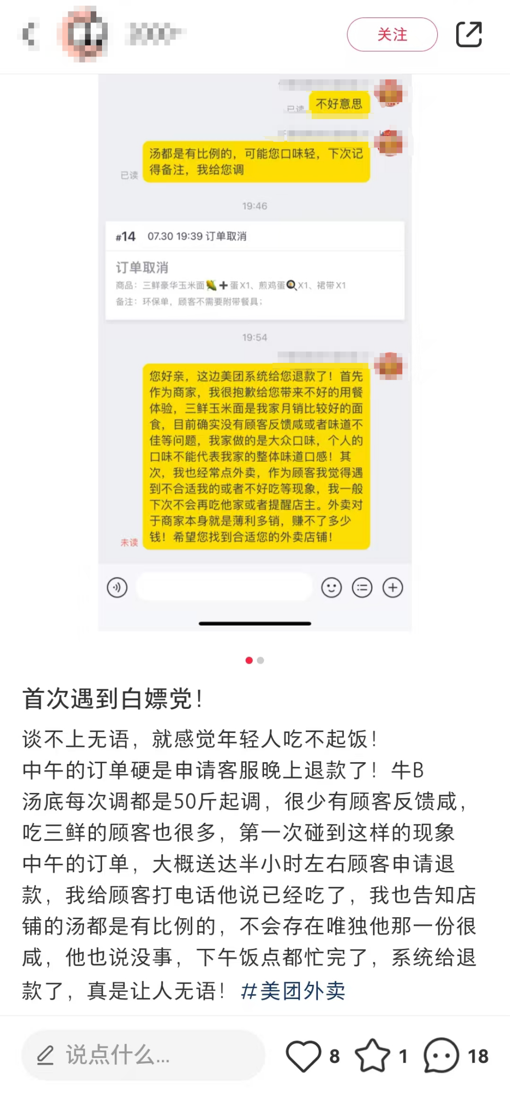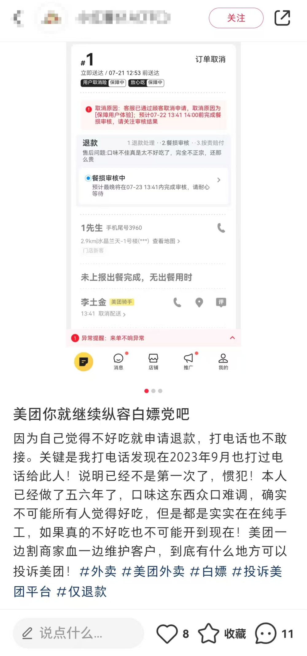 然而,这一默许滋生出了“白嫖党”,他们恶意使用“仅退款”在美团上吃起了“霸王餐”。