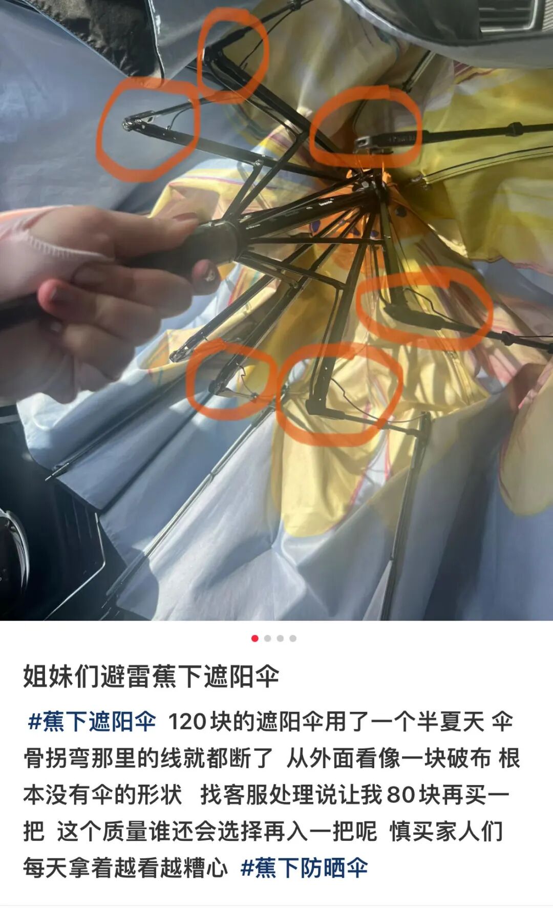比如蕉下上百块钱的太阳伞,就被不少人吐槽用过几次就坏了。