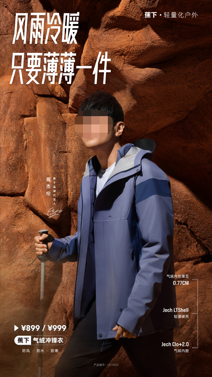 去年周杰伦主推的一款气绒冲锋衣,就瞄准的是秋冬户外场景。