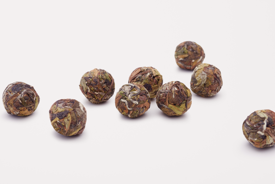 山田土「圆气满满」寿眉龙珠,产自磻溪湖林,海拔700—900m,被东南湿润的水汽光照,茶叶长得饱满,气息甜柔。经过萎凋、干燥,蒸压成巧克力球形态,利于将“香气”凝在方寸之内。