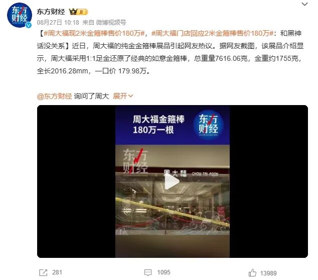 近日,周大福门店惊现一根霸气十足的 2 米长金箍棒,售价高达 180 万!