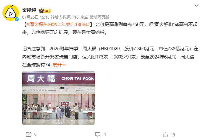 值得一提的是,周大福内地市场净减少 91 家店铺,上一季度也减少了 89 家,这意味着过去半年平均每天关闭一家门店。