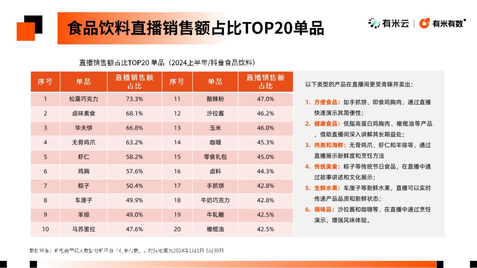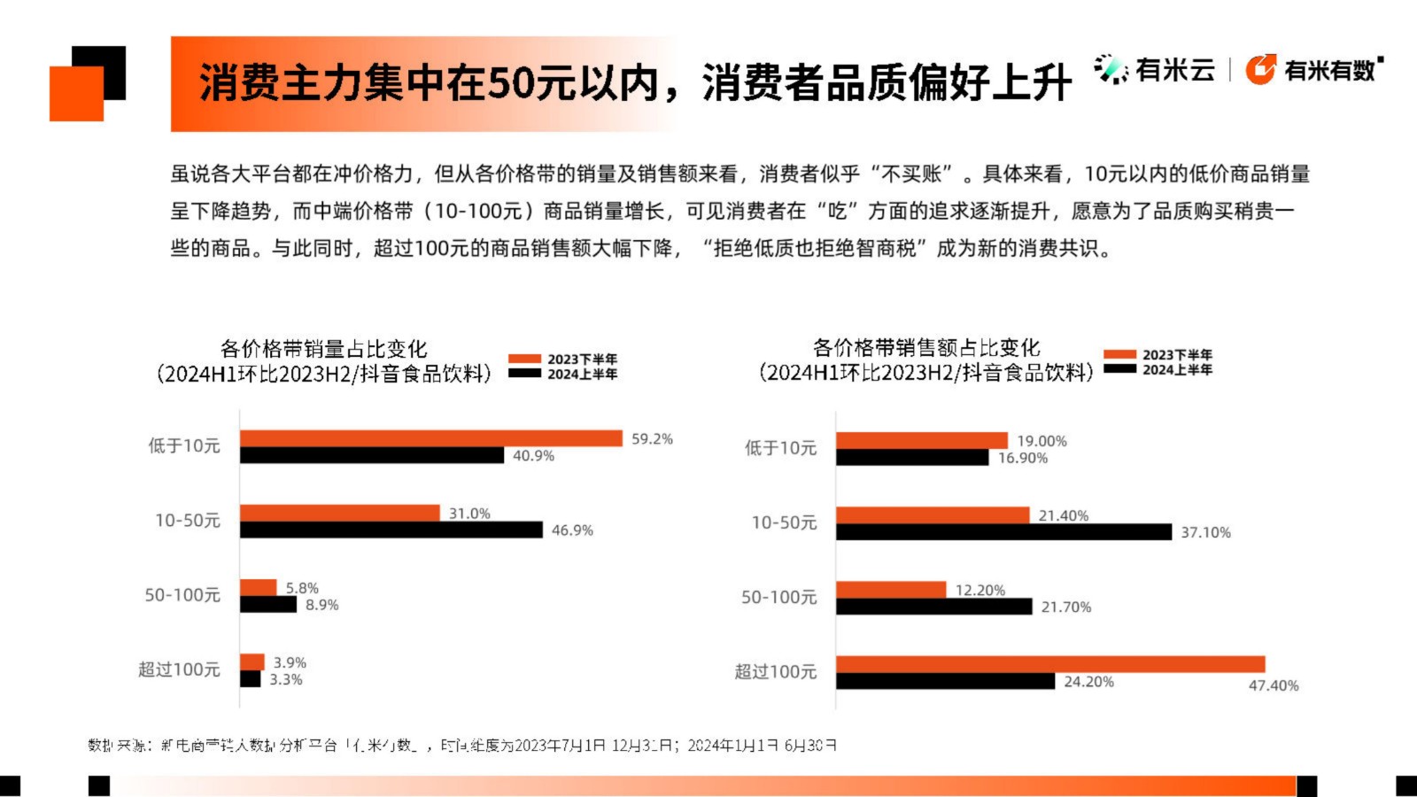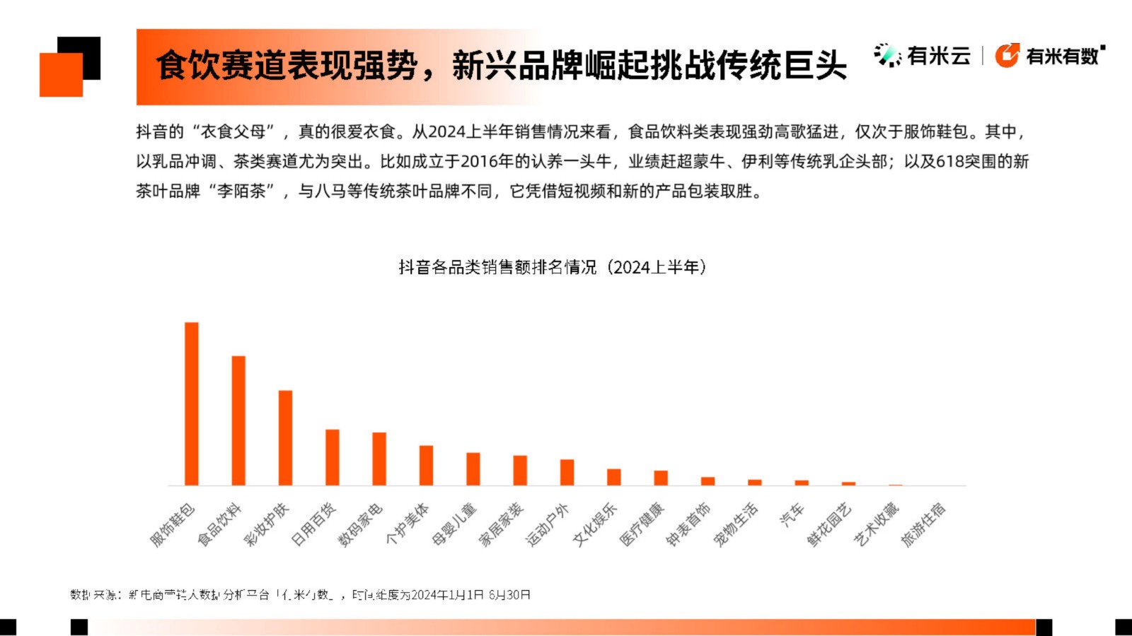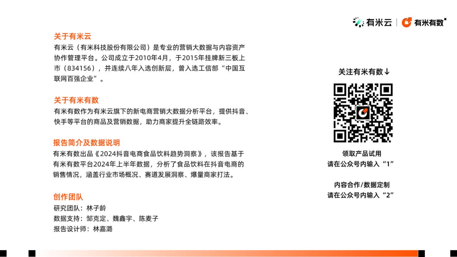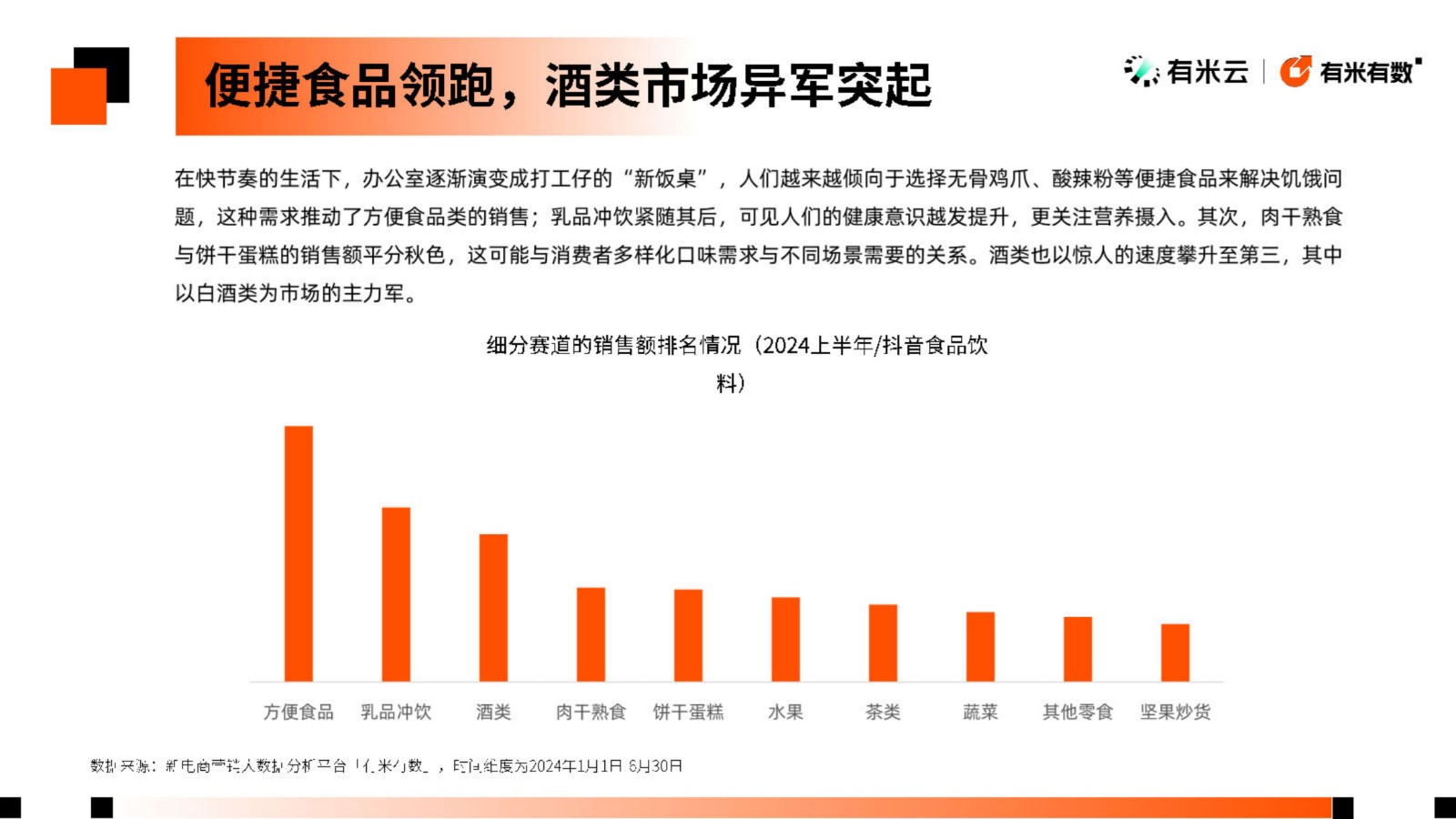 基于此,有米有数出品《2024抖音电商食品饮料趋势洞察》,围绕2024年上半年的数据分析,深入探讨食品饮料在抖音电商的销售现状、市场趋势以及商家的营销策略,为行业参与者带来一份全面的市场指南。