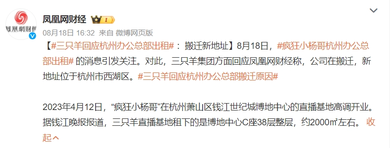 8月中旬,又有“疯狂小杨哥杭州办公总部出租”、“三只羊回应杭州办公总部出租”等消息冲上热搜,引发市场担忧头部主播的生存现状或不如之前。