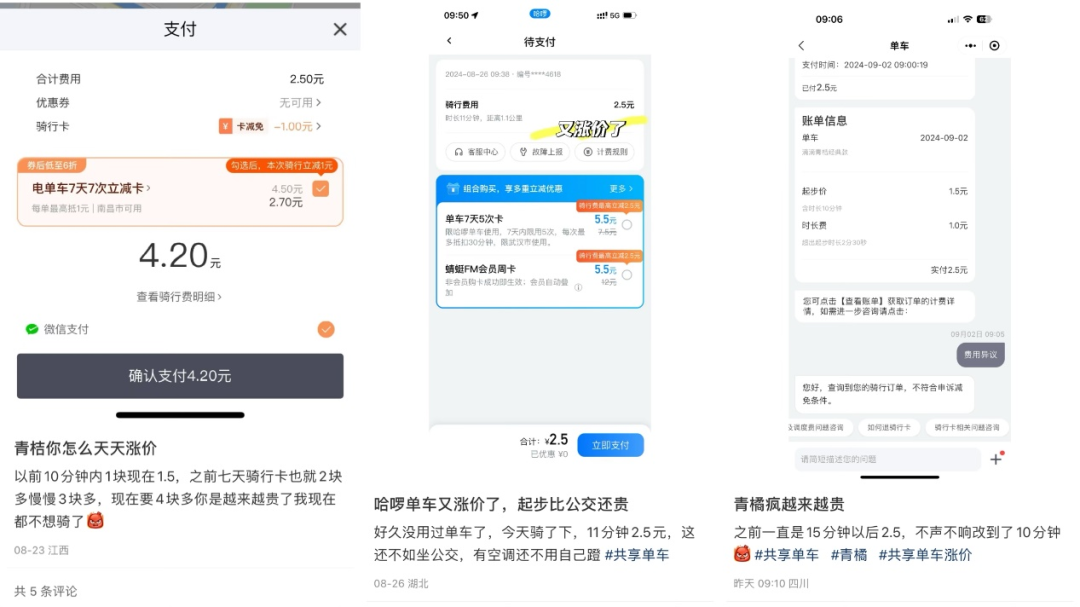 除了单次骑行的收费标准发生了变化,月卡、周卡和学期卡等各种骑行卡的费用也有所变化。其中,有网友提到,青桔电单车地7天7次骑行卡之前价格在2-3元,但最近涨至4元左右。另一位网友则提到南京市的哈啰助力车校园卡也涨价了,“上学期买的学期卡89元,这个学期快开学了点进去一看,120天要210元?请问哈啰你这个价格的意义是什么?为了多骗点大学生的钱吗?”